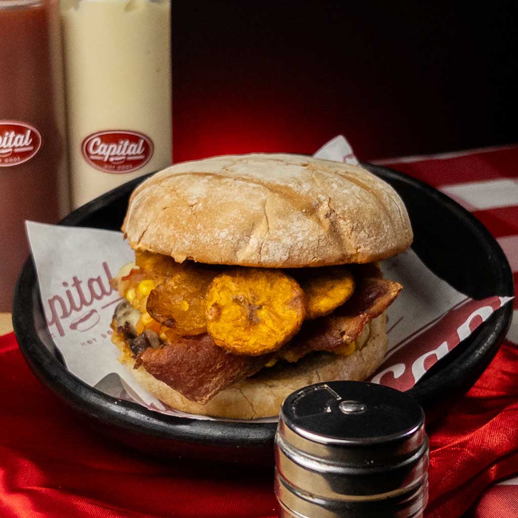 Hamburguesa con pan artesanal y carne artesanal de 130 gr. Chorreada capital (hogao), queso, paipa, tocineta picada y madurito.