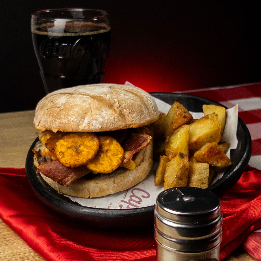 Pan artesanal y carne artesanal de 130 gr. Chorreada capital (hogao), queso, paipa, tocineta picada y madurito.+ Bedida 250ml ó Agua 600ml + Papás o Nachos.