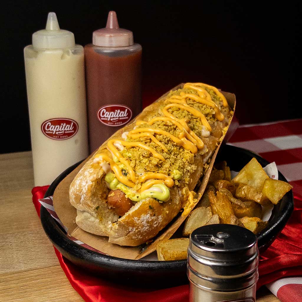 Perro caliente con pan artesanal y salchicha de 80 gr. Pico de gallo, salsa de aguacate,  salsa chipotle, nachos triturados y queso cheddar+ Bedida 250ml ó Agua 600ml + Papás o Nachos.