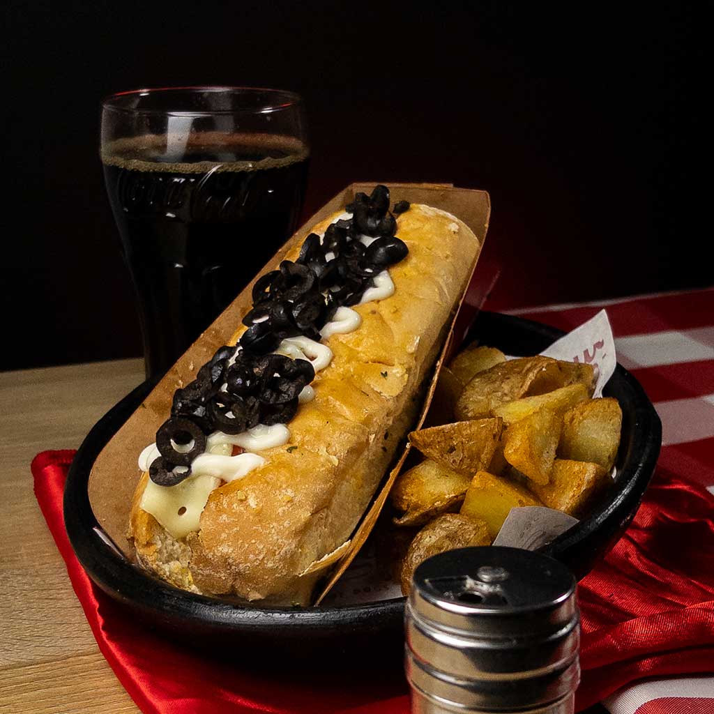 Perro caliente con pan artesanal y salchicha de 80 gr. Mayonesa de ajo, aceitunas negras, pimientos asados, queso + Bedida 250ml ó Agua 600ml + Papás o Nachos.