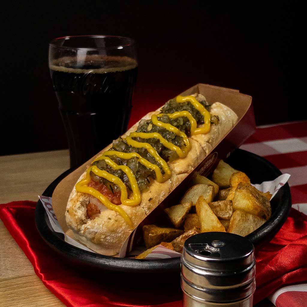 Perro caliente con pan artesanal y salchicha de 80 gr. Sweet Relish, Mostaza, Cebollas en curtidas , tomate + Bedida 250ml ó Agua 600ml + Papás o Nachos.